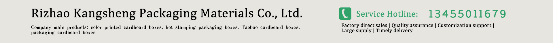 ????Rizhao Kangsheng Packaging Materials Co., Ltd. is located in Rizhao, the tail wing and water sports capital of Shandong Peninsula. It is 100 meters south of the intersection of Chongqing Road and Haikou Road in Rizhao Economic Development Zone, Shandong Province. It was registered and established on June 23, 2009 at the Market Supervision and Administration Bureau of Rizhao Economic and Technological Development Zone with a registered capital of 20 million RMB. Our company is a strong enterprise that integrates independent design, printing, and production of cardboard boxes, pizza boxes, moving cardboard boxes, color printed cardboard box design, printing, and post binding packaging.